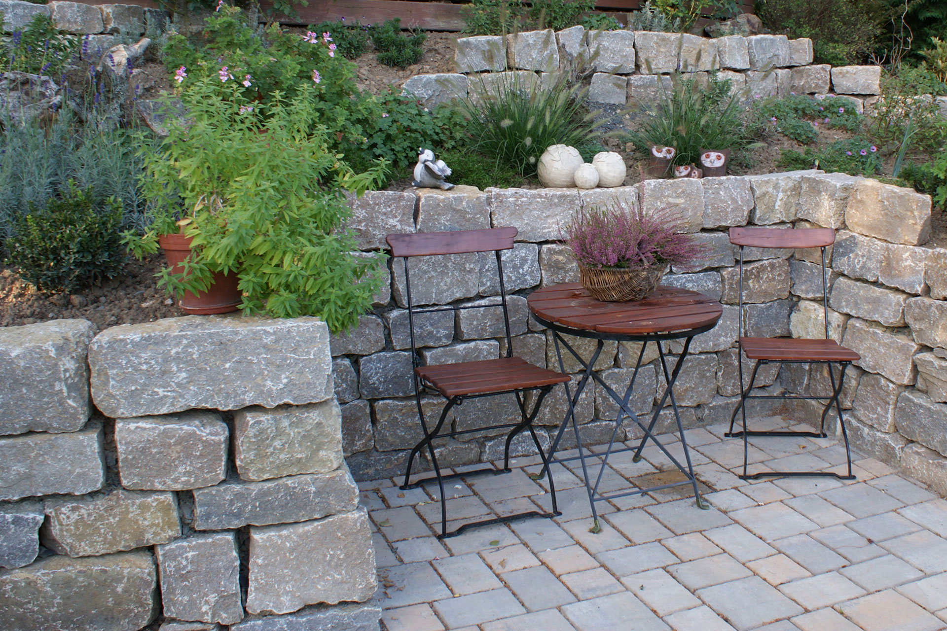 Als Material eignen sich fast alle Steinarten. Wer sich einen rustikalen, natürlichen Charme im Garten wünscht, sollte Natursteine aus der Region, zum Beispiel Basalt, Sand- oder Kalkstein, wählen. Diese sind in der Regel naturbelassen oder nur grob behauen und erschaffen mit ihrer Unebenmäßigkeit ein schönes Erscheinungsbild.